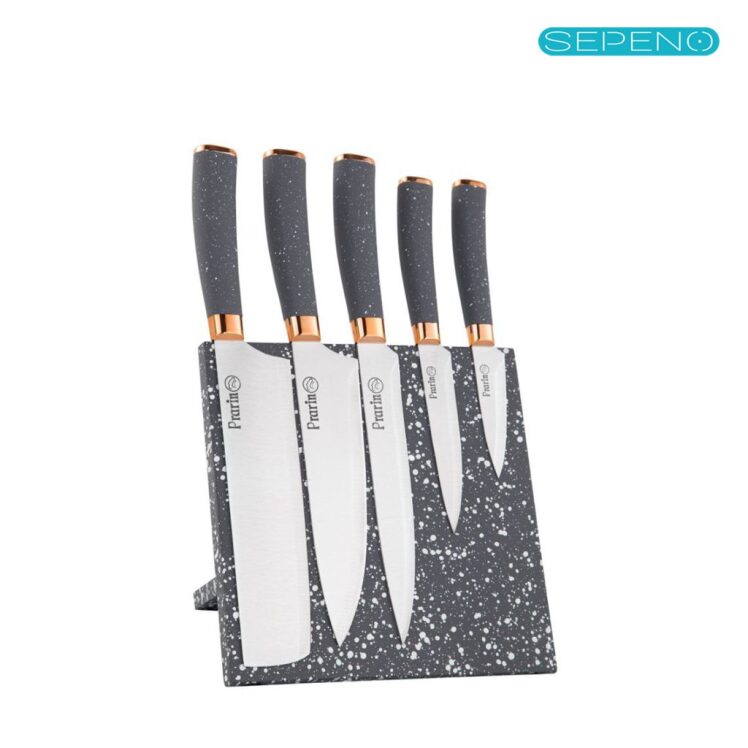 چاقو های این سرویس از استیل ضد زنگ یک تکه و دسته باکالیت سافت تاچ با طرح گرانیت تولید شده است که هماهنگی بسیار زیبایی را با سایر ظروف آشپزی به وجود می آورد که شامل :