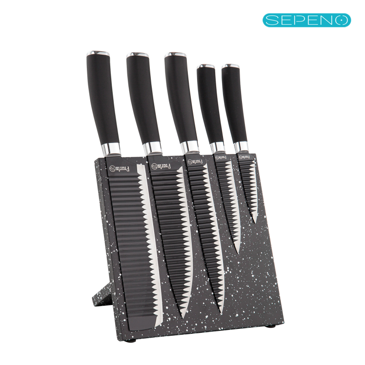 چاقو های این سرویس از استیل ضد زنگ یک تکه و دسته باکالیت سافت تاچ با طرح گرانیت تولید شده است که هماهنگی بسیار زیبایی را با سایر ظروف آشپزی به وجود می آورد که شامل :